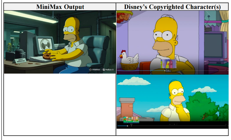 本次诉讼书指出,海螺AI在推广中自称为“口袋里的好莱坞工厂”(a Hollywood Studio in your pocket),并提供了多个MiniMax 涉嫌侵权的案子。例如,如果 MiniMax 订阅用户输入提示词:“荷马·辛普森正在工作的卡通形象”,海螺 AI 模型会生成一张高清、可下载的辛普森形象,其角色版权属于迪士尼。
